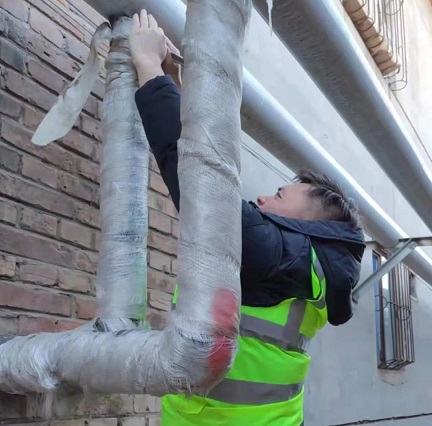 "咱們先把這段管網(wǎng)的巖棉扒了,都戴上手套,別扎著"初二中午12點,筆者在云鼎所車站西街華聯(lián)超市倉庫內(nèi)看到新華西分公司檢修所李明和工作人員正在查找跑水點,他說:"11:30接到電話反映這里二次管網(wǎng)跑水,我就趕緊帶著工作人員過來了,由于這個管網(wǎng)的保溫是巖棉,很扎人,我們處理的時候得小心一些。"沒過一會兒他們就在DN80二次管網(wǎng)上找到了跑水點,為了不影響正常供熱,李明決定帶水帶壓用打卡子的方式封堵漏點,經(jīng)過半個多小時的作業(yè),搶修完成。李明告訴筆者:"春節(jié)對于我們來說和平時一樣,我來富泰熱力工作了20年了,年年如此,也希望和家里人一起過個春節(jié),可是我們要是休息了,用戶家里用熱方面有什么事兒怎么辦,工作性質(zhì)就是這樣,既然選擇了這份工作,我就得把它做好。"